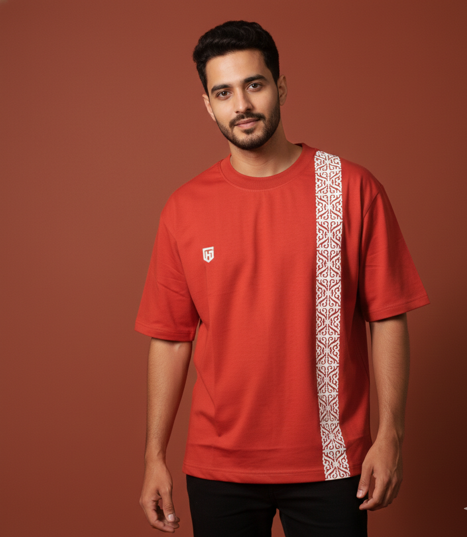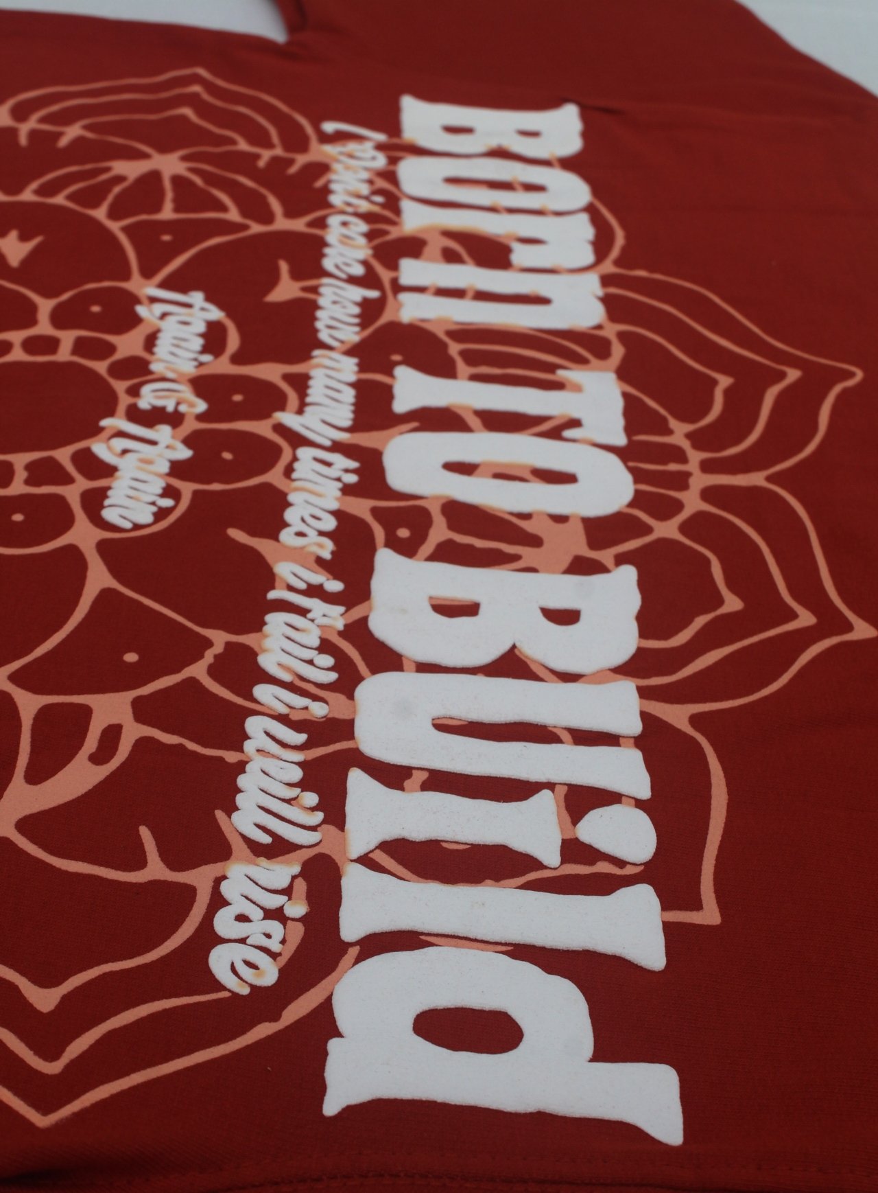 ” Born To Build ” Oversized Tee in rich brick red pairs elevated design with street-ready attitude. Design detailsThe back showcases a bold, screen and puff printed mandala-inspired artwork that delivers texture and visual depth for a premium look and tactile feel.